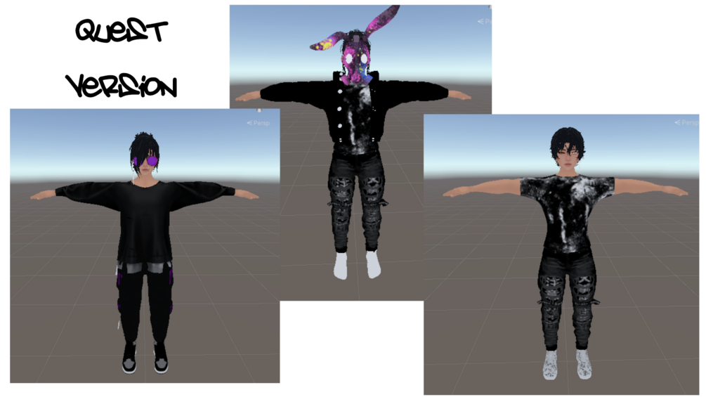 Things that don't work for Quest: Chain glove, Fishnet long sleeve, particle effects, skintone slider (CAN BE CHANGED IN THE PROJECT, just change before upload), eyebrow slit(s) change.